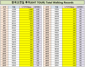 길 여행 전문 온라인 뉴스 로드프레스(대표 오택준)가 지난 16일 강릉바우길에서 처음 열린 한국고갯길 그랑프리(KGP)를 성공적으로 마친 참가자들의 걷기 누적 기록(Walking Records)을 발표했다.강릉바우길 행사에 참여한 고선화님이 1,409km를 기록하며 부동의 1위를 유지하고 있으며, 그 뒤를 이어 박영미님, 김진호님, 김세기님이 1,200km 이상으로 선두권을 형성하고 있다. 현재 기준 500km 이상 17명, 1,000km 이상 5명이 인증을 받은 상태이다.올해는 제주도 한라산 둘레길, 울릉도 순환 종주 등 다양한