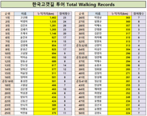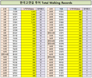 길 여행 전문 온라인 뉴스 로드프레스(대표 오택준)가 지난 6월 25일과 26일 부안 변산마실길에서 열린 한국고갯길 그랑프리(KGP) 4라운드를 마친 참가자들의 걷기 누적 기록(Walking Records)과 상위 입상자들의 시간 기록, 중간 순위를 공개했다.KGP 1~4 라운드에 일반부로 모두 참석하고 있는 고선화님이 1,599km를 기록하며 부동의 1위를 지키고 있으며, 박영미님이 1,442km로 2위, 1,200km 이상 김세기님, 김진호님, 조재국님이 3위에서 5위를 기록하고 있다. 현재 기준 누적거리 500km 이상 18명