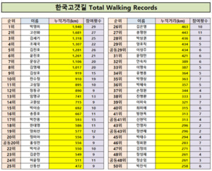 길 여행 전문 온라인 뉴스 로드프레스(대표 오택준)가 지난 4월 30일과 5월 1일 양평물소리길에서 열린 한국고갯길 그랑프리(KGP) 2라운드를 마친 참가자들의 걷기 누적 기록(Walking Records)과 상위 입상자들의 시간 기록을 발표했다.1라운드 강릉바우길에 이어 2라운드 양평물소리길 대회에 참여한 고선화님이 1,462km를 기록하며 1위를 유지하고 있으며, 그 뒤를 박영미님이 1,335km로 추격하고 있다. 김진호님, 김세기님이 1,200km 이상으로 3위와 4위를 차지했으며, 조재국님도 1,146km로 꾸준히 상위권을