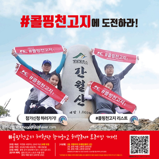 이번 1기 콜핑천고지 체험단은 총 20명으로 구성될 예정이다. 자연을 사랑하고 등산과 산에 열정을 가진 사람이라면 누구나, 전국 에디에서나 참가할 수 있다. 체험단 모집은 콜핑 공식 홈페이지와 SNS(페이스북·블로그·인스타그램)에서 동시에 진행되며 참가신청서를 작성하여 제출하면 신청이 완료된다.