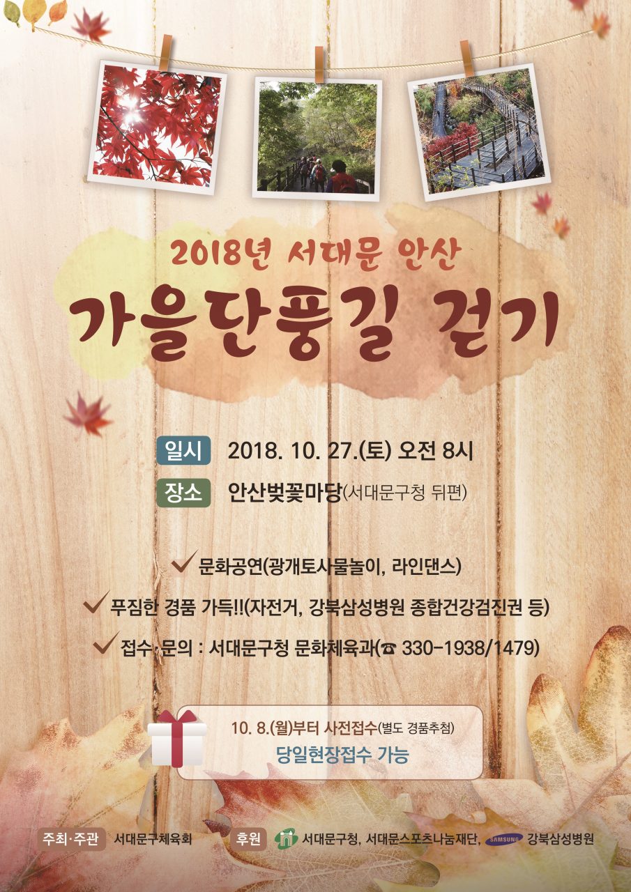 서울 서대문구청이 오는 27일 토요일, 구 내의 단풍 명소이자 안산 자락길로 많은 사랑을 받고 있는 서울의 대표 트레킹 구간인 안산에서 '2018년 서대문 안산 가을 단풍길 걷기 축제'를 연다고 밝혔다. 일시는 2018.10.27.(토) 08:00~11:00까지이며 참석을 희망하는 이는 08시 이전까지 출발장소인 안산 벚꽃마당(서대문구청 뒤편)에 집결하면 된다.