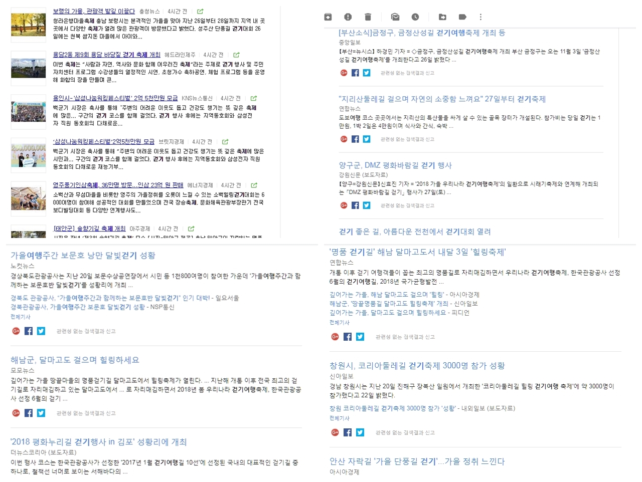 가을여행주간을 앞세워 전국의 지자체마다 서로 ‘걷기대회(걷기축제)’를 한다고 아우성이다. 많을 때에는 하루에도 수십개의 길 관련 보도자료중 태반이 걷기대회가 개최된다는 홍보성 자료들이다. 그러나 수많은 걷기행사의 개요를 하나하나 짚어보자면 허탈함을 감출 수 없는 내용들이 부지기수다.