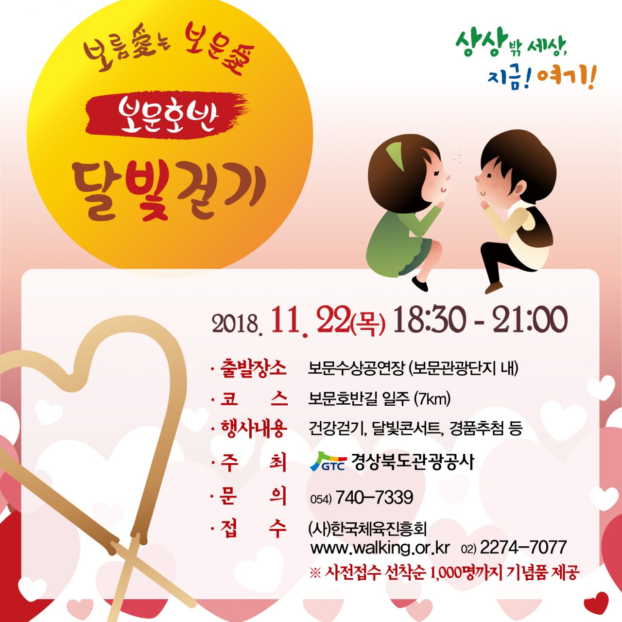 이번 행사는 '보름愛는 보문愛 보문호반 달빛걷기'로 11.22(목) 18:30 ~ 21:00까지 열린다.