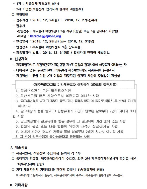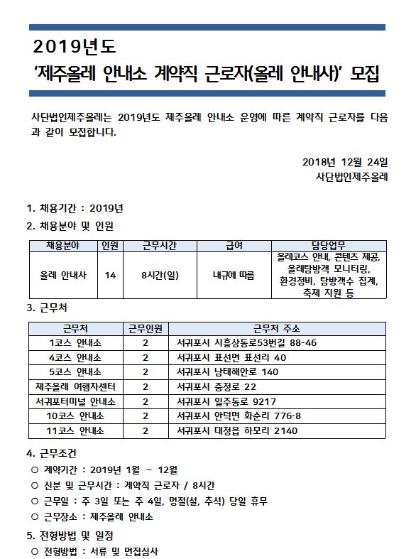사단법인 제주올레에서 제주올레 안내소에서 근무할 '올레 안내사'를 모집한다고 밝혔다. 접수기간은 12월 27일 오늘까지이며 자세한 일정 및 모집요강은 제주올레 홈페이지(http://www.jejuolle.org/)의 올레소식 메뉴를 통해 확인이 가능하다. 해당 공고에 첨부된 파일을 다운로드 후 이메일로 접수하면 된다.