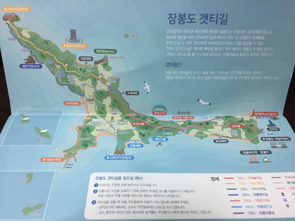 장봉도 여행자안내센터에서 가이드북 등을 받는다. 장봉도 갯티길 가이드북을 받는다. 안에는 전체 지도와 각 코스별 안내, 그리고 각 코스의 스탬프를 받을 수 있는 페이지가 있다. 모두 채우면 인증서와 소정의 상품을 준다고 한다.
