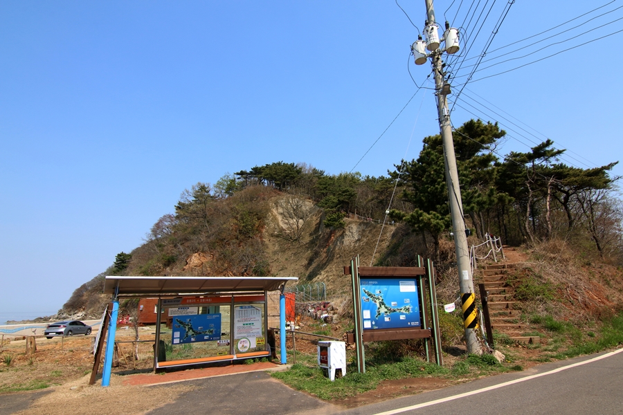 건어장 해변 정류소 옆으로 계단이 산을 향해 이어져 있다. 본격적으로 4코스 장봉해안길을 시작하는 지점이다.