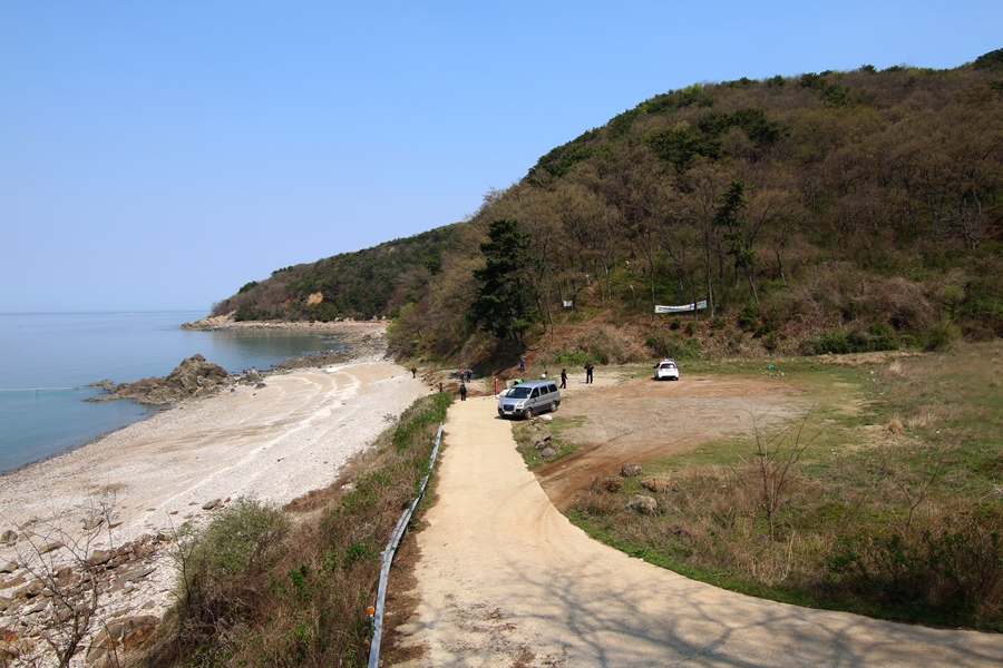 내려오니 해변이 펼쳐진다. 산을 뒤로 하고 너른 공터와 해변, 갯바위가 함께 어우러진다. 캠핑에 알맞은 장소다.