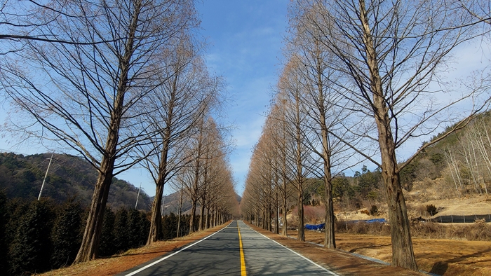 장승삼거리를 출발하여 산 밑의 하천을 끼고 걷다보면 장승마을을 지난다. 이름이 재미있는 '벌떼가든'에서 백반으로 점심식사를 마친다. 길을 이어가면 부귀면의 자랑이자 진안군의 명물 중 하나인 메타세콰이어 길을 만나게 된다. 길게 뻗어있는 풍경은 아름답기 그지없다. 워낙 차가 없는 길인지라 한가운데서 용기내어 사진도 찍어본다. 겨울이라 아쉽지만 초여름만 되어도 참으로 걷기에도, 드라이브하기에도 좋은 길일 듯 하다.