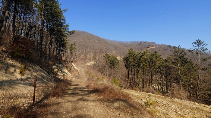 임도는 금남정맥 방면으로 이어진다. 완만히 오르내리기를 몇 차례, 우측의 골프장에서 웃고 떠드는 소리가 걷는 이의 귀에 들려온다. 한참은 떨어진 곳이건만 그토록 선명하게 들리는 것은 그만큼 이 길이 고요하고 또 고개가 깊기 때문일 것이다.