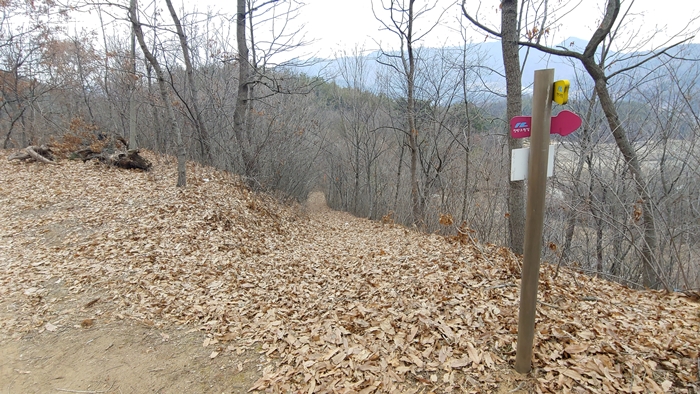 가만히 보니 임도의 끝에서 산으로 이어지는, 한 명이 간신히 지날 만큼의 오솔길이 나 있다. 표식을 찾아 그 오솔길로 걸어들어가 입봉을 내려간다.