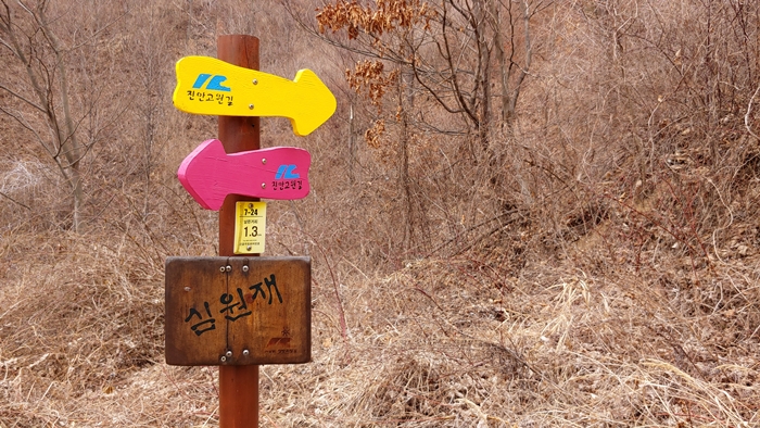 숲길을 지나 심원재의 임도를 만난 후 천천히, 순리에 따르듯이 길을 오른다. 완만히 오르는 심원재 임도는 8코스에서 마조마을을 향해 넘어야 하는 갈크미재보다 훨씬 유순하다.
