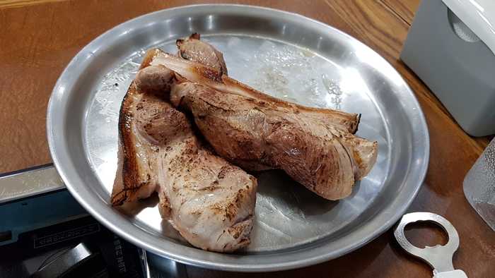 무한리필이라더니 한 번에 리필 할 것까지 나오나? 거대한 크기를 자랑하는 흑돼지 앞다리살(전지)이 연탄불 속에서 바디의 지방을 커팅하고 훈훈한 모습으로 탈바꿈하여 눈앞의 불판 위로 올라간다. 마치 진정한 ‘흑’은 이런 것이라는 것을 보여주듯 껍데기 부분에는 거뭇거뭇한 털들이 박혀있고, 살 부분이 살짝 부끄러웠는지 더욱 노릇노릇하게 익히고 나왔다.