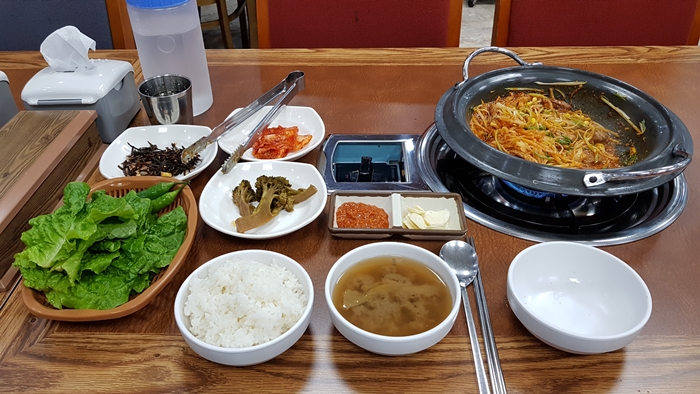 불판이 다가온다. 화구에 당당하게 올라앉은 불판 위로 뚝배기 그릇이 등장. 고기가 익는 동안 천천히 끓어오를 된장국이다. 이어서 아직은 당당한 콩나물이 온몸에 참기름을 두르고 반합의 중간뚜껑에 올라타서 된장국 옆으로 사뿐하게 앉는다. 올 것이 왔다! 작지만 반짝반짝한 '스댕' 종지 속에 내공을 숨기고 있는 멜젓(멸치젓)이 초반 기선제압을 한다.