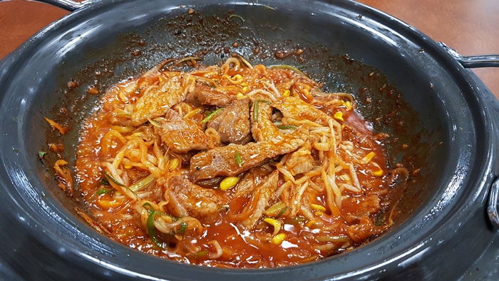 열전도율이 높아 보이는 넓은 냄비에 이미 어느 정도 익혀진 돼지고기와 숨죽은 콩나물, 파가 조화롭게 섞여 있다.