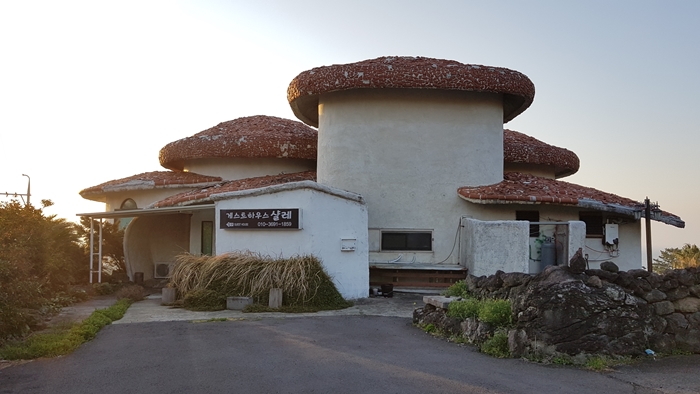 *5번 게이트 600번(서귀행) 리무진버스 : ‘대포항’ 정류소 하차(20개 정류장, 약 1시간 소요) → 하차 후 뒤돌아서 버스가 왔던 방향으로 도보 약 3분(우측의 귀여운 버섯모양 샬레 게스트하우스 발견)