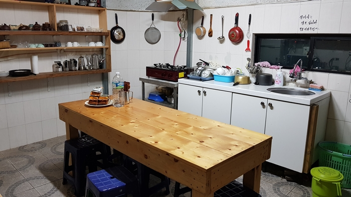 냄새가 많이 나서 상대방에게 피해를 줄 수 있는 ‘고기 굽기’, ‘생선구이’는 절대 금지! 실수하지 않을 만큼의 적당한 음주를 지향하는 냉장고의 문구! 아침에 먹을 수 있는 컵라면(때로는 봉지라면도 존재한다)과 냉동실, 냉장실에 식빵이 준비되어 있고, 새벽에 일어나서 조리를 해도 객실까지 소리가 새어나가지 않도록 주방에도 문이 있다. 식사 후 환기를 할 수 있는 창문을 열면 여름이나 겨울이나 시원한 바람이 솔솔 들어온다.