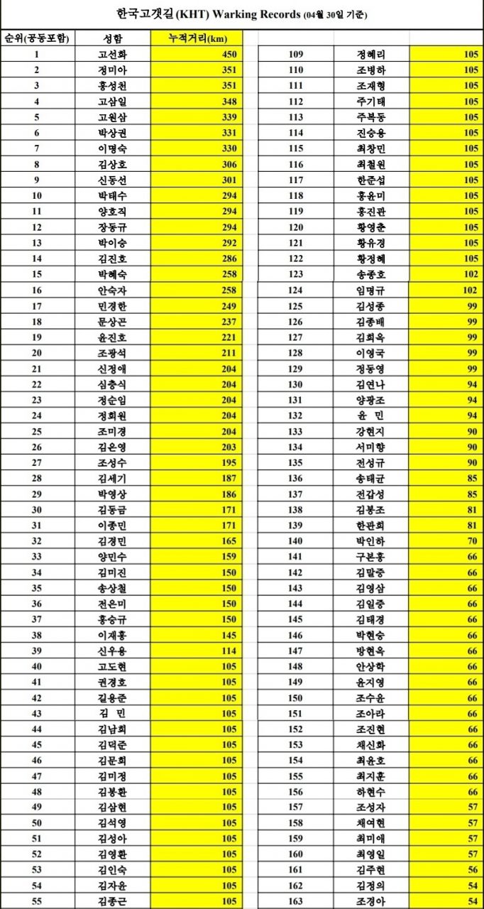 길 여행 전문 온라인 뉴스 로드프레스(대표 오택준)는 지난 29일 끝난 '한국고갯길(KHT) TOUR IN 진안' 행사까지의 걷기 기록(Walking Records)을 누적, 참가자들의 기록을 발표했다. 작년 7월에 열린 첫 대회 이후 2019년 4월까지 총 7회에 걸쳐 진행된 행사 기간 동안 현재 1위는 450km를 걸은 고선화님으로, 그 뒤를 공동 2위인 홍성천, 정미아님이 차지했다.