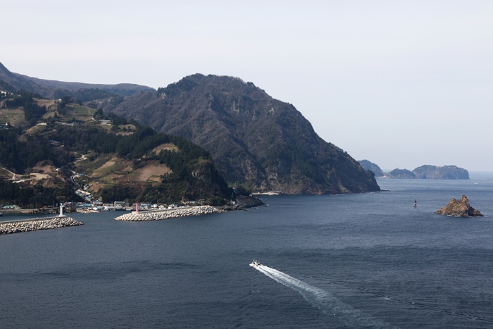 저동항의 앞으로 북저바위가, 그리고 그 뒤로 관음도와 죽도가 보인다.