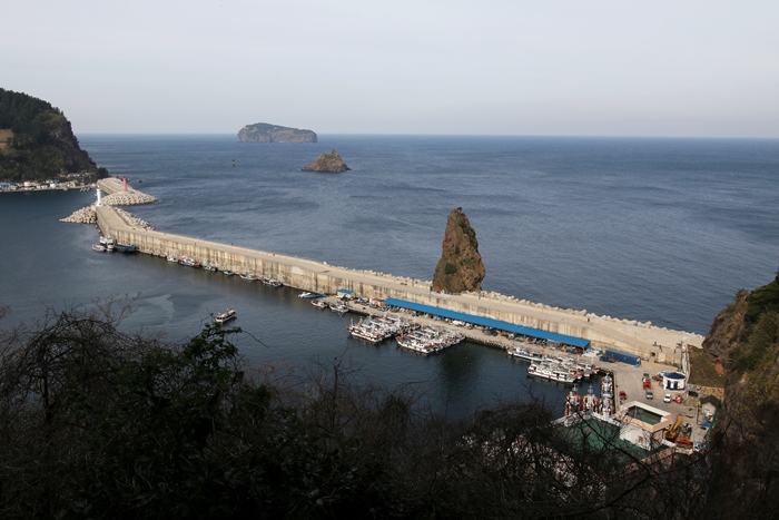 내려와 작은 어선 정비소 옆의 구멍가게에서 캔 음료를 하나 사서 마신다. 목이 따갑게 내려가는 그 청량함, 이 길을 울릉도 여정의 첫 길로 선택하기 잘 했다는 자찬으로 축배를 든다. 다리를 잠시 주무른 뒤 촛대바위가 우뚝 선 방파제로 향한다.
