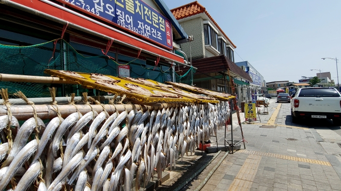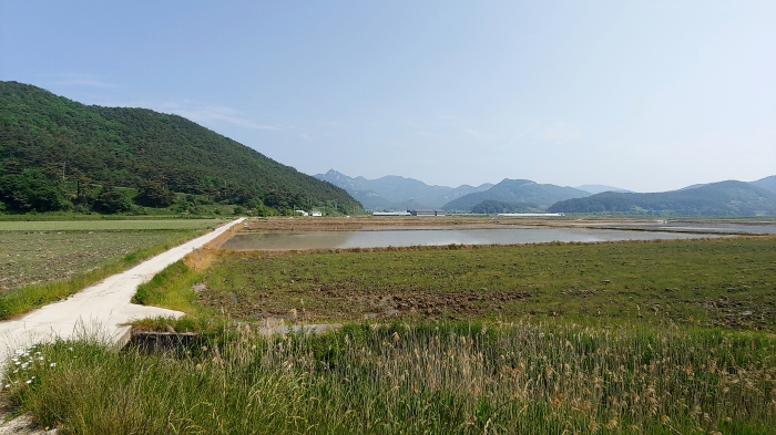 긴 방죽을 지나 잠시 산을 올라 도로로 접어든다. 도로를 따라 걷다가 내려간 곳은 작당마을. 평화롭고 한적한 그 마을의 보호수 밑에서 잠시 땀을 닦는다. 작열하는 태양을 맞으며 마동방조제를 따라 왕포마을을 만난다.