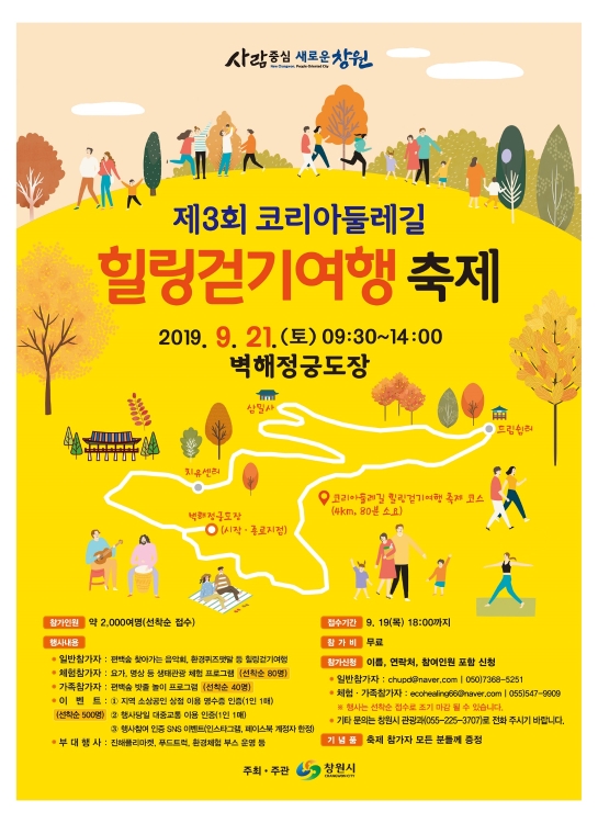 창원시(시장 허성무)는 오는 21일 진해구 벽해정궁도장에서 ‘제3회 코리아둘레길 힐링걷기여행 축제’를 개최한다고 9일 밝혔다. 도보 여행을 통한 지역경제 활성화와 창원 생태관광•코리아둘레길을 알리기 위해서다.