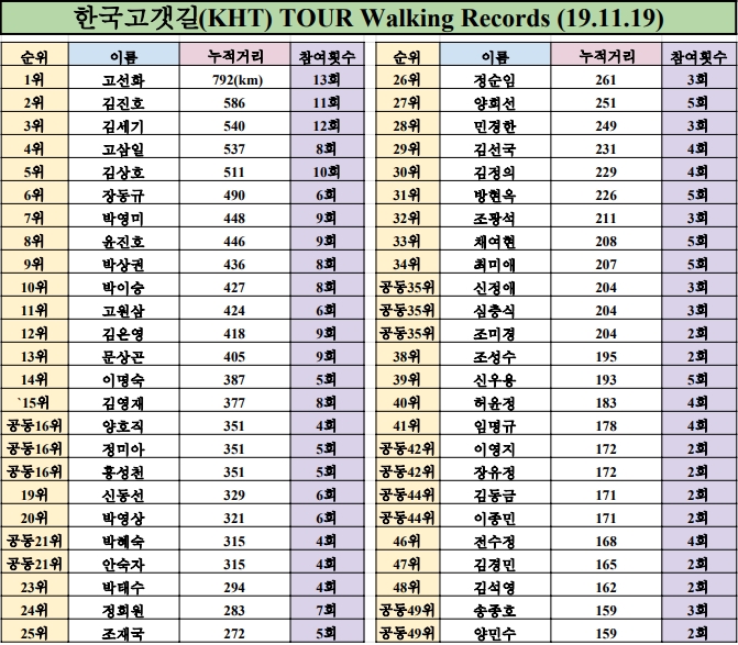 길 여행 전문 온라인 뉴스 로드프레스(대표 오택준)는 지난 11월 10일 끝난 ‘제 15회 한국고갯길(KHT) TOUR mini in 울산(영남알프스)’ 행사까지의 걷기 기록(Walking Records)을 누적, 참가자들의 기록을 발표했다.