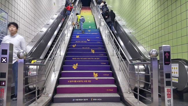 건강계단은 계단 전면 및 벽면에 계단 이용의 건강 효과, 칼로리 소비효과, 기타 건강정보 등을 표시해 엘리베이터, 에스컬레이터 대신 계단을 이용하도록 관심을 유도해 일상 생활 속 계단 걷기 실천에 도움을 주고 있다.