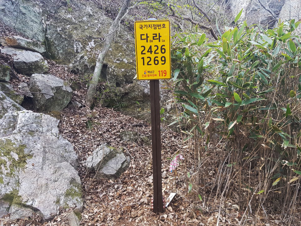 해남군은 2016년부터 달마산16개, 두륜산14개, 달마고도8개, 주작산 옥천용동임도21개, 흑석산18개, 두륜산25개에 국가지점번호판 102개를 설치해 활용하고 있다.