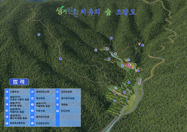 4년간의 조성이 마무리 단계인 '생거진천 치유의 숲'은 이월면 송림리 산29-1번지 일원에 자리한 힐링 테마 공원으로 건강증진센터, 숯채화효소원, 꽃마당치유원, 치유숲길, 명상욕장 등으로 꾸며졌다.