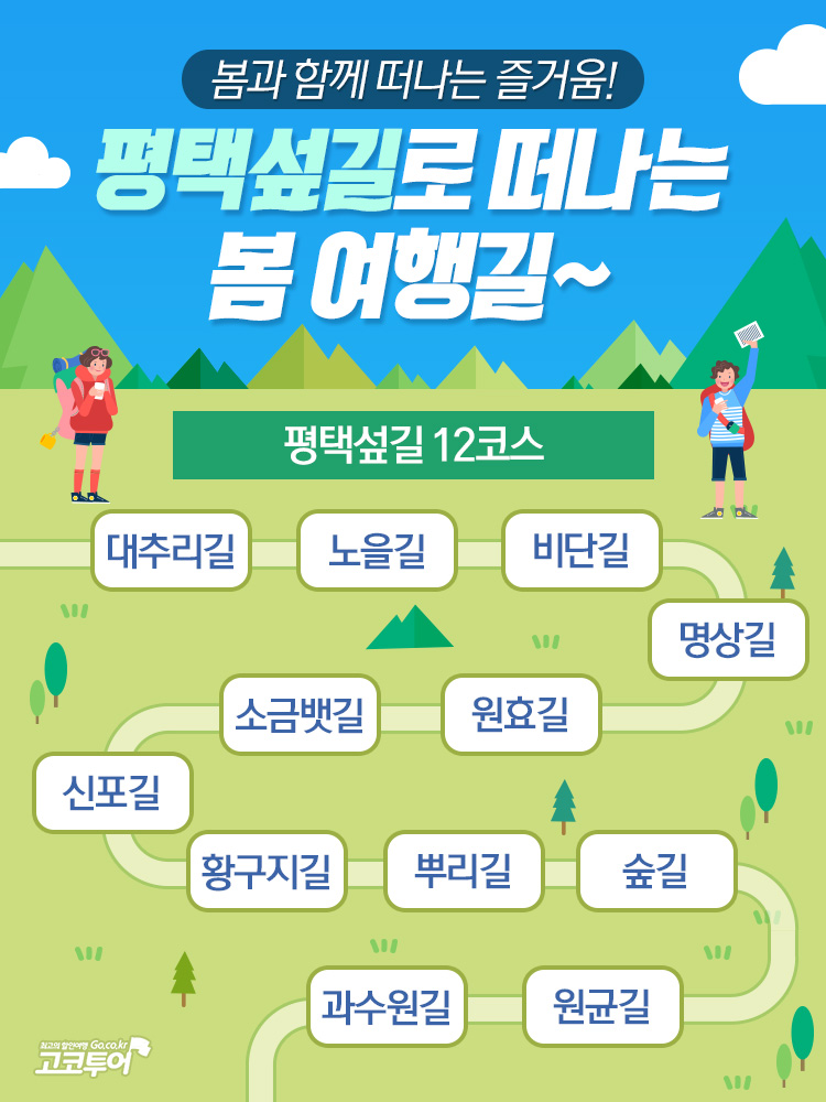 숙박 앱 고코투어(대표 박기범)가 제주도 올레길 처럼 걷기 좋은 평택섶길을 소개했다. 평택섶길은 한복의 웃옷 깃에 달린 작은 조각이란 뜻을 갖고 있는 ‘섶’에서 따온 이름으로 ‘평택을 둘러보는 작은 길’이라는 의미를 가지고 있다.