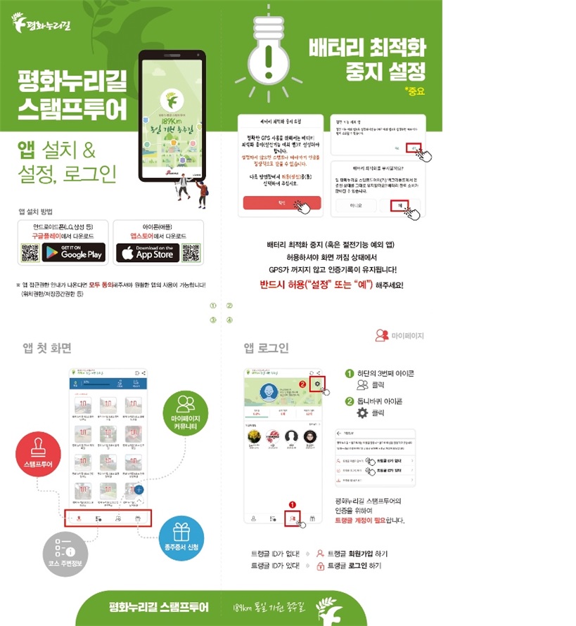 어플리케이션은 구글플레이(안드로이드)와 앱스토어(아이폰)에서 ‘평화누리길 스탬프투어’로 검색하면 누구나 쉽게 내려 받아 사용할 수 있다. 향후 불편사항을 지속 수렴해 개선해 나갈 계획이며, 음성으로 길을 안내하는 방식과 주변 관광지를 소개하는 기능도 추가 개발할 예정이다.