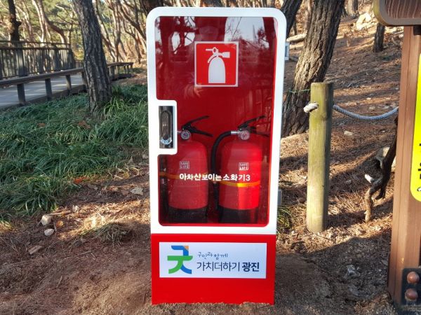 광진구는 지난해 10월 행정안전부로부터 재난안전특별교부세를 지원받아 올해 3월 아차산에 시민들이 직접 사용할 수 있는 산불 진화용 소화기 7대를 설치 완료했다. 소화기는 산불이 일어나면 누구나 바로 사용할 수 있도록 등산객들의 이동이 많은 아차산둘레길, 등산로 등 주요 교차점에 설치됐다.