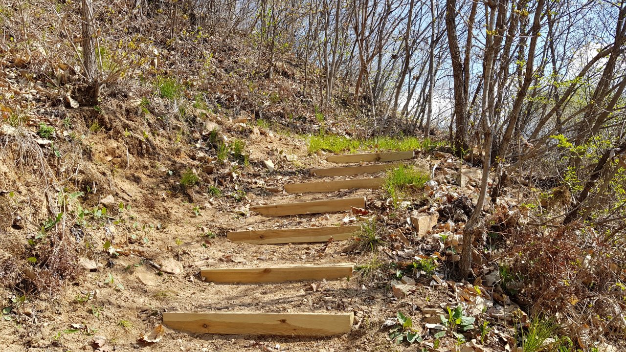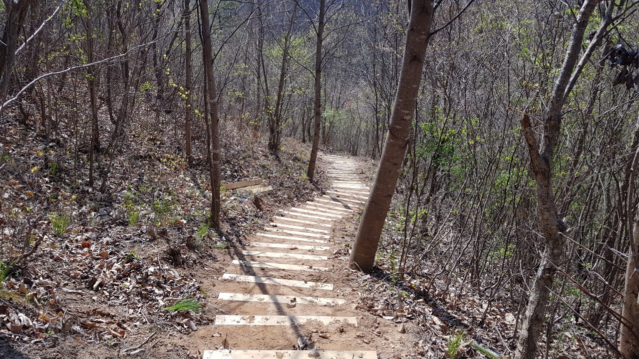 진안고원길은 해빙기를 지나 본격적으로 트레킹 인구가 늘어나는 봄을 맞아 12코스 "고개너머 동향길"의 갈골재 구간에 계단설치 공사를 진행하고 있다.