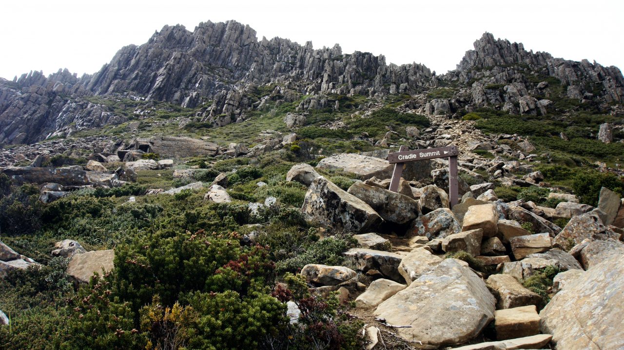 크레이들 마운틴의 정상까지 가는 사람은 많지 않아 우리 이외에는 호주 본토에서 왔다는 젊은 남녀 2 명밖에는 보지 못했다. 이 곳에서부터 정상까지는 왕복 2시간 반이 걸린다는 안내판이 붙어 있는데 길은 급격히 경사가 심해지며 돌이 많은 너덜 바위 구간으로 변한다. 예전에 너덜길로 힘들었던 설악산의 황철봉 구간의 너덜길 보다도 더 험한 구간이라 생각되었다.
