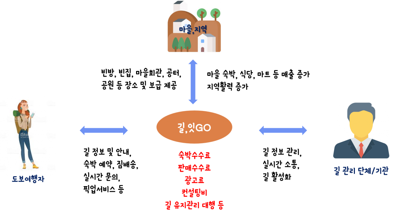 (주)오디스에서 개발 중인 '길잇GO'는 도보여행자의 도보여행을 위한 모든 정보와 인프라를 지원하는 플랫폼이다.