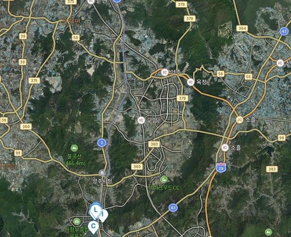 위에 열거한 조건들을 곱씹어보면서 혹여 그 산맥과 앞에 보이는 산 들을 잇는다면? 만약 그 시작지점에 대중교통(지하철역)이 위치한다면? 이라는 생각을 가지고 가장 먼저 위성지도로 지형을 내려다보았다.