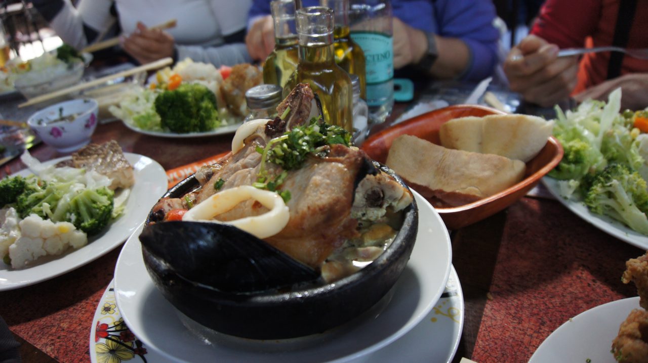 일단 시원한 맥주와 바켓 빵, 샐러드 등이 나오고 메인 요리가 나오는데 해물 모듬탕은 생선과 가리비 같은 해물 뿐 아니라 돼지고기 수육과 심지어 닭고기까지 같이 들어 있어 육, 해, 공이 다 모여 있는 정말 잡탕 요리였다.