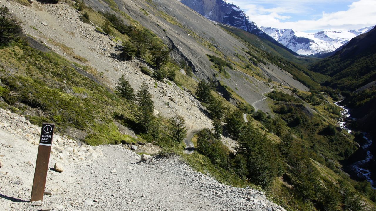 1시간 정도 숲길을 지나고 나니 넓은 갈림 길이 나오고 이정표와 안내판이 여러 개 있다. 이곳 밑에는 캠핑 사이트 이며 이 곳 부터 1Km 정도 더 올라가면 이 날 트레킹의 최종 목적지인 토레스 델 파이네를 조망 할 수 있는 호수가 나타난다. 하지만 이 1Km가 상당히 어렵다. 경사도 꽤 심한데다 온통 바위와 자갈길이다.
