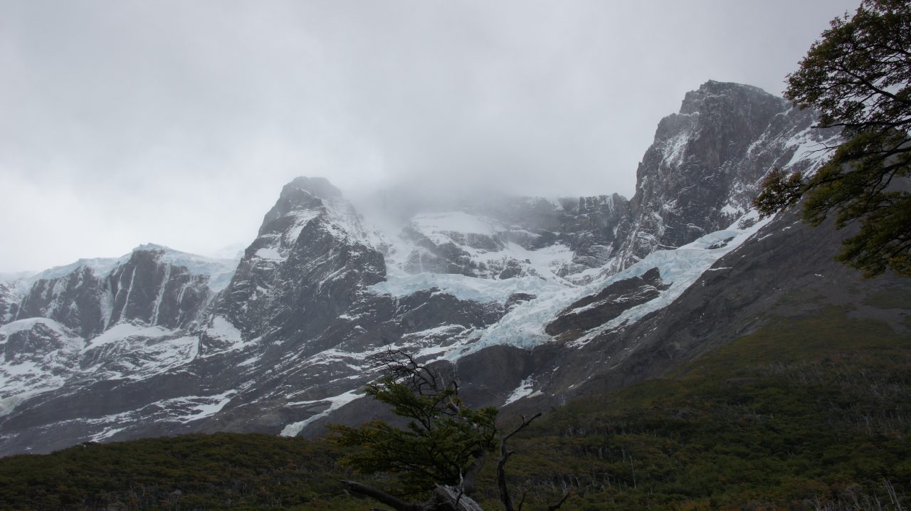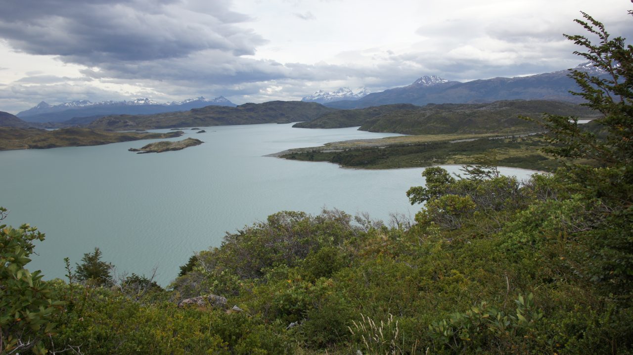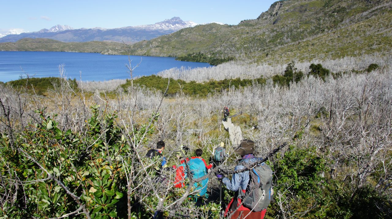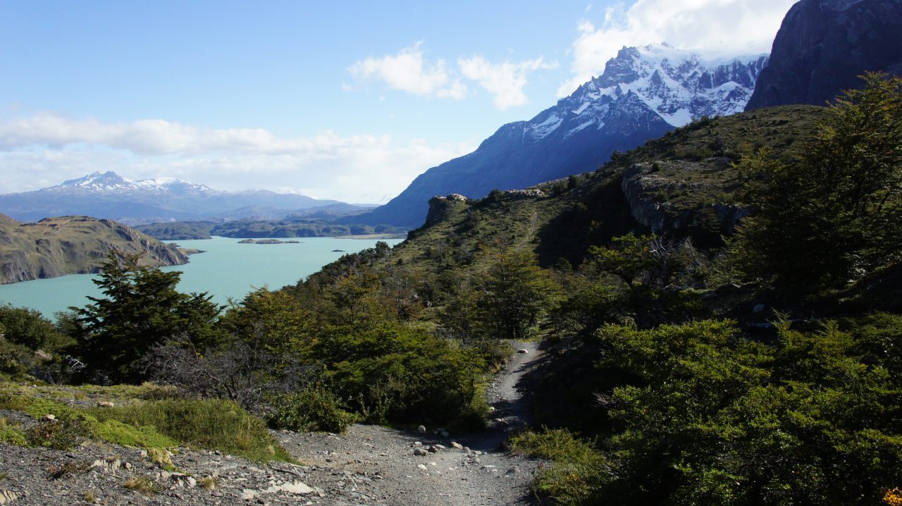 30 분 정도 숲속 길을 걷다보니 갑자기 눈앞이 탁 트이면서 오른쪽 편으로 눈에 뒤 덮인 거대한 산이 나타난다. 2,600m 높이의 쿠에르노스 산이다. 눈 덮인 산 밑에는 단풍이 들기 시작한 숲 그리고 왼편에는 에메랄드 빛 호수가 같이 어우러져 W 트레킹 코스 중에서 가장 멋진 풍광중의 하나를 보여준다.