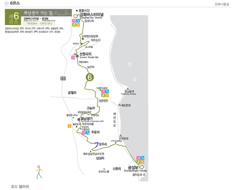전체길이는 홈페이지와 앱이 서로 상이합니다. 홈페이지는 강화버스터미널에서 광성보까지 18.8km, 6시간 소요라고 표기되어 있고 앱에서는 강화버스터미널에서 오두리입구(터진개)까지 14.6km, 4시간으로 소개하고 있습니다.(앱에서도 코스경로는 또 광성보까지 따릅니다.)