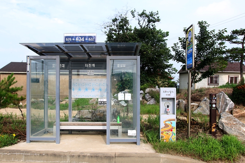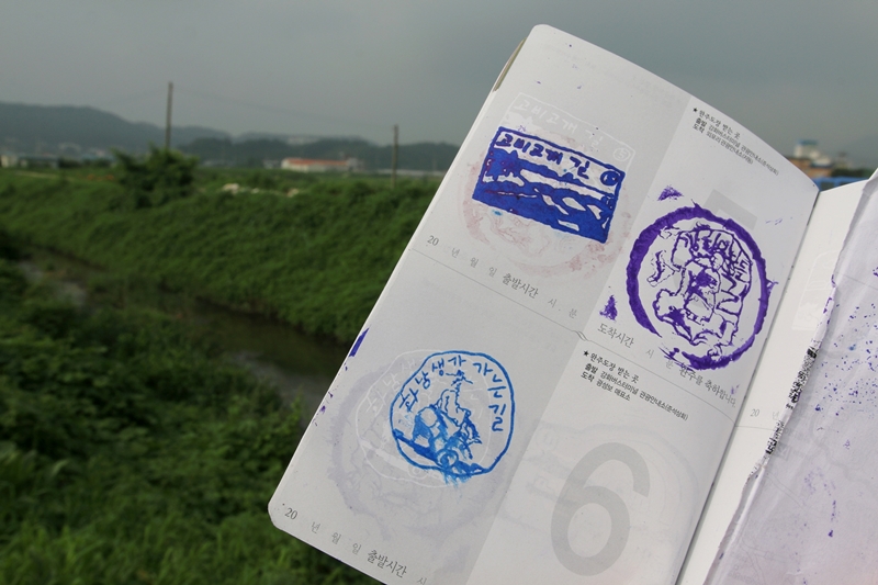 오두리 입구, 터진개 정류장에 비치된 도착지점 스탬프를 나들길 여권에 힘차게 누릅니다.