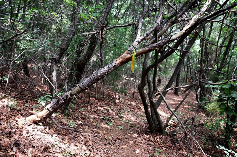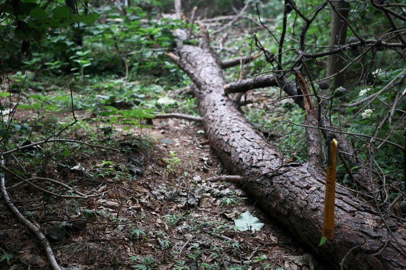 산길을 가로막은 나무때문에 당황한 순간, 주위를 둘러보아도 리본이 없습니다.
