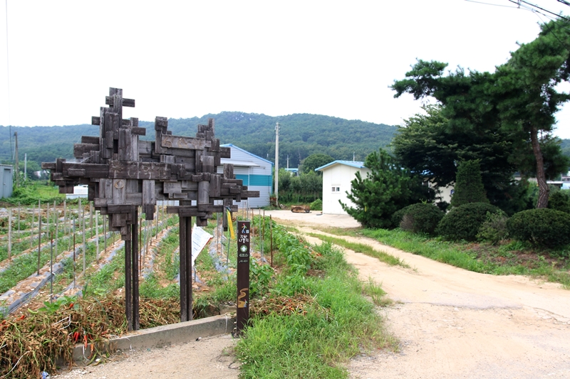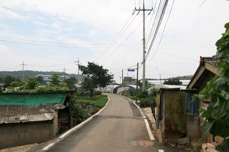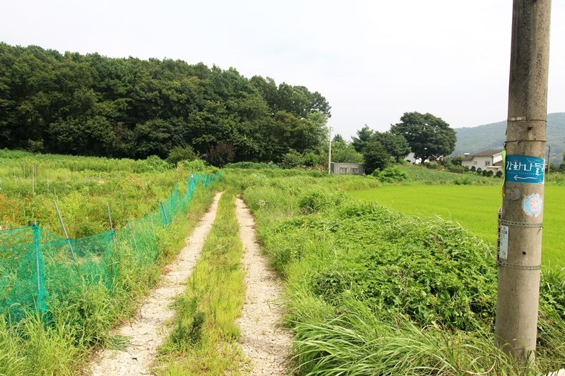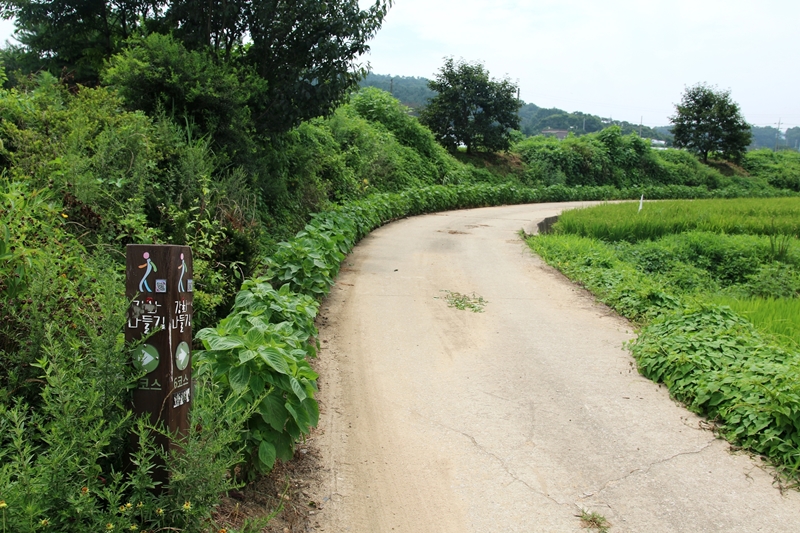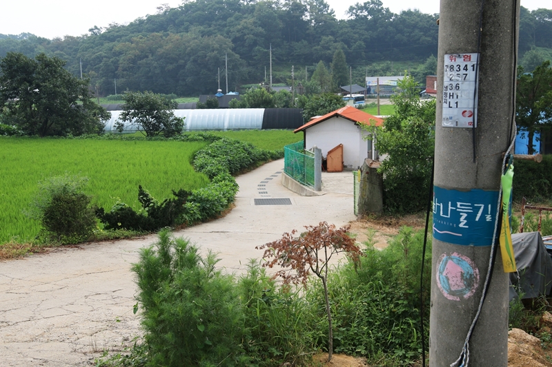 마을회관 앞의 쉼터에서 잠시 쉰 후, 마을표지판을 따라 난 길로 (마을 회관 앞에 4갈래의 길이 있답니다.) 걷다보면 아까 막혀서 건너지 못한 구간이 보입니다. 도랑의 오른쪽이지요,
