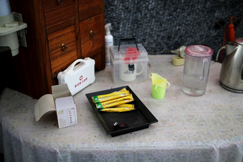 쉼터 안에는 차를 끓여 먹으며 앉아 쉴 수 있는 시설과 구급약 등도 있습니다. 고맙기 그지없습니다.