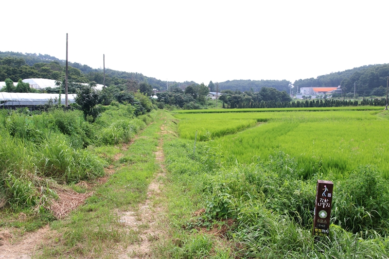이 노인 복지관을 지나 논길로 접어들게 되는데, 논길의 입구에서 6코스의 시작 스탬프를 받을 수 있습니다.