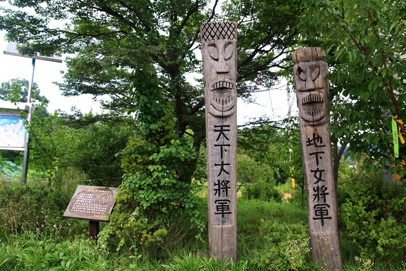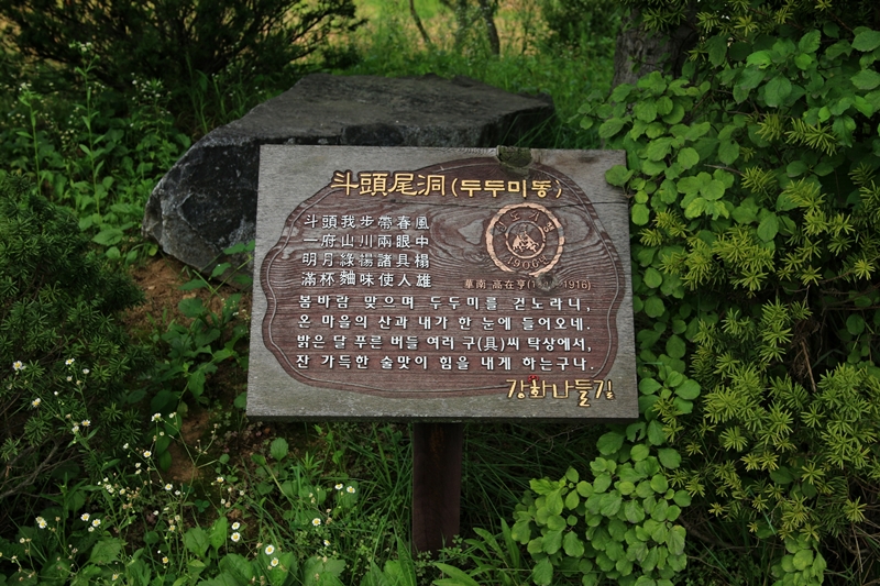 쉼터를 지나 두두미마을의 입구로 나옵니다. 입구의 장승과 선생의 시가 울적한 마음을 달래주네요.