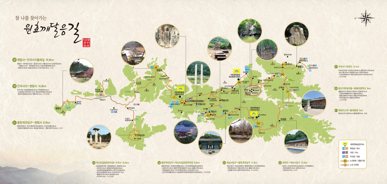 문 : 우리는 엄청난 자연풍경을 가지고 있지 못하다. 그저 여기와서 ‘쉼’을 느끼고 가는 길이 되었으면 좋겠다. 사찰도 많고 문화유산도 많으므로 하나하나 걷고 보며 쉬어갔으면 좋겠다.