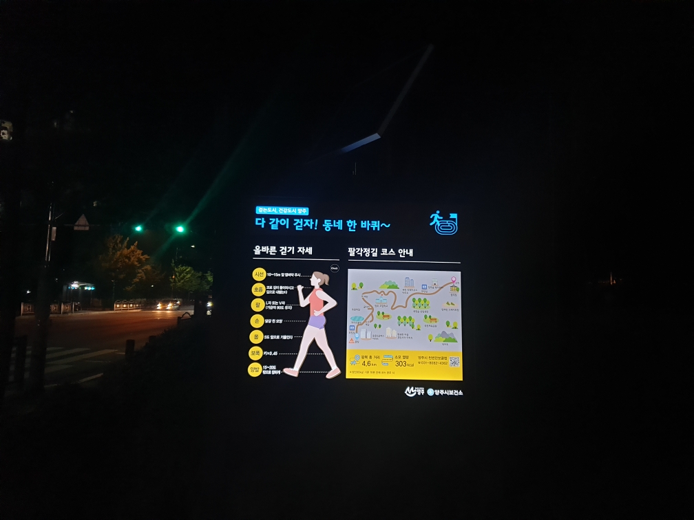 양주시(시장 이성호)는 코로나19 사회적 거리두기 조치 강화로 인한 외부활동의 제약으로 신체활동이 줄어든 시민들의 건강증진을 위해 ‘우리동네 걷기 길’에 LED 건강걷기 안내판을 설치했다고 밝혔다. 안내판에는 걷기코스지도, 코스별 총거리, 소모칼로리양, 올바른 걷기자세, 걷기 전·후 스트레칭 방법 등 걷기운동에 유용한 정보를 담고 있다.