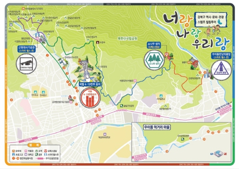 스탬프 힐링투어는 강북구의 주요 역점사업인 ‘북한산 역사문화관광벨트 조성사업’의 세부사업 중 하나로 국립4·19 민주묘지를 시작으로 순국선열 16위 묘지가 있는 초대길을 지나 근현대사 박물관, 소나무 쉼터, 우이동 만남의 광장에 이르기까지 강북구의 대표 관광명소들을 둘러 볼 수 있게 기획된 프로그램이다.