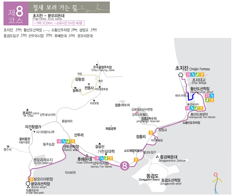 코스 중에는 산길은 전혀 없이 해안 도로와 제방을 따라 걷게 되며 식사할 곳이나 화장실, 쉼터 등의 편의시설도 잘 갖추어져 있습니다.